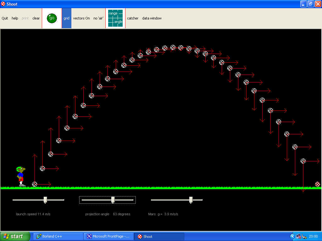This program allows you to kick a football on the Moon and various planets. The lad can be made to kick the ball at different angles and at different launch speeds. The range is measured and can be plotted for each kick . Also the 'grid' coordinates of the path and the velocity vectors can be displayed.